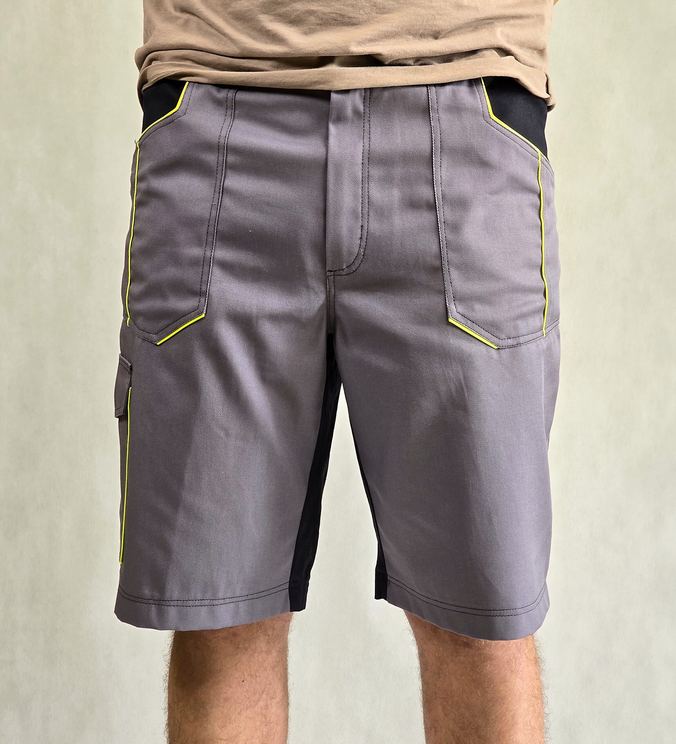 Krótkie spodenki, wykonane z wyjątkowo wytrzymałej tkaniny. Profesjonalne szycie zapewnia nie tylko trwałość, ale również estetykę wykonania. Podwójne szwy oraz liczne ryglówki solidnie wzmacniają miejsca szczególnie narażone na wyrwanie. Sześć kieszeni w tym trzy z patkami zapinanymi na rzepy zapewniają wygodne przechowywanie drobiazgów. W krocze spodenek jest wszyty elastyczny element materiału, który ma zapewnić komfort ruchów. W pasek, po bokach wszyta guma. Po prawej stronie na wysokości uda zamocowana gruba taśma na młotek. Dodatkowo w kieszonki powszywana w odblaskowym kolorze wypustka.