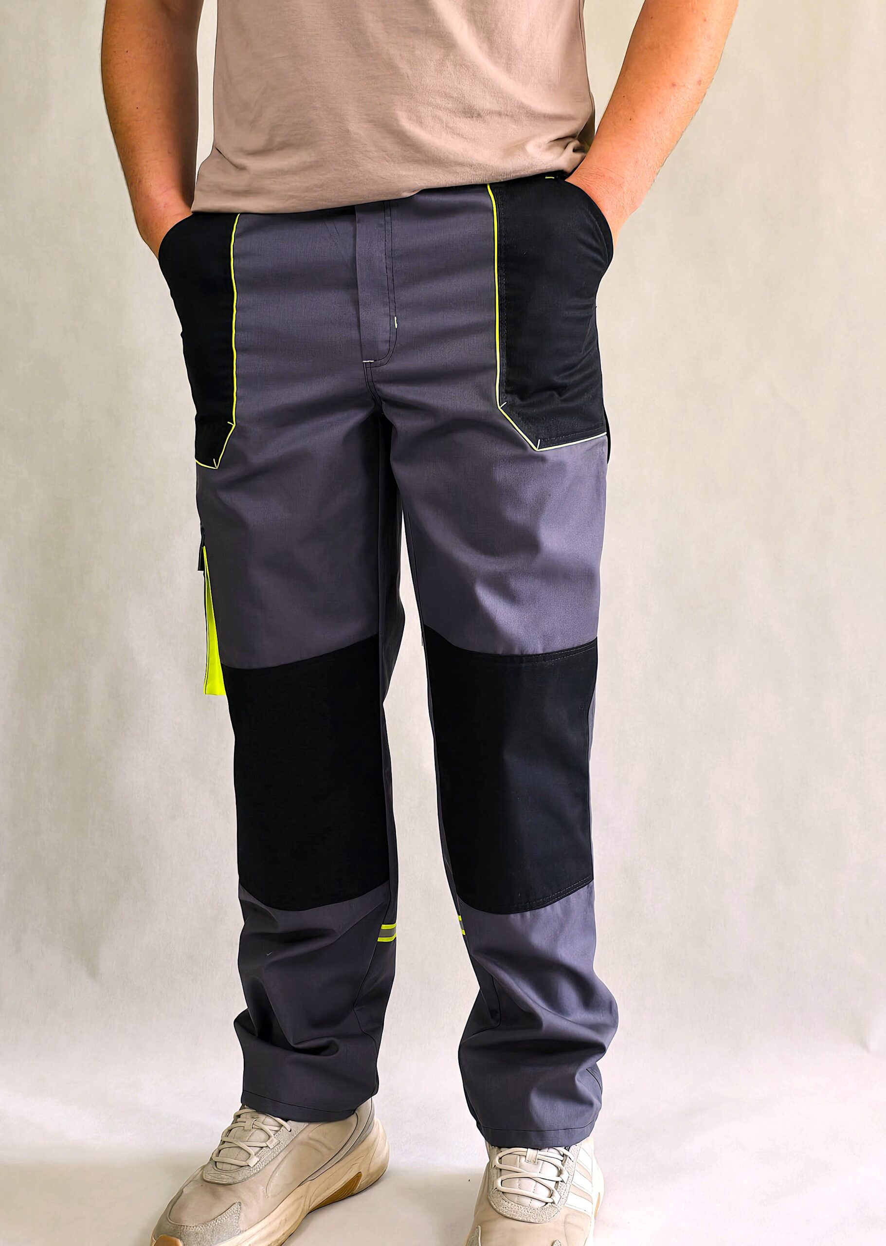 Długie spodnie robocze, wykonane z wytrzymałej tkaniny. Profesjonalne szycie zapewnia nie tylko trwałość ale również estetykę wykonania. Podwójne szwy i liczne rygle solidnie wzmacniają miejsca narażone na wyrwanie. Sześć kieszeni w tym trzy z patkami i rzepem zapewniają wygodne przechowywanie drobiazgów. W pasek po bokach wszyta guma. Na wysokości kolan naszyty dodatkowo materiał wzmacniający. Na łydkach z tyłu spodni naszyta taśma odblaskowa, która umożliwia lepszą widoczność. Dodatkowo w kieszonki, wszyte w odblaskowym kolorze wypustki.