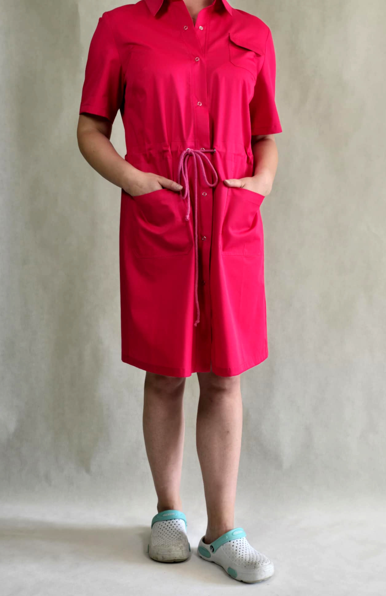 Fartuch długi, na krótki rękaw. Model zapinany z przodu na napy. Przy szyi elegancko prezentujący się kołnierzyk. Na wysokości bioder dwie głębokie kieszenie. Jedna mniejsza kieszonka z patką na wysokości piersi, po lewej stronie. W pasie tunel ze sznurkiem, pozwala na dopasowanie fartucha do sylwetki. Długość fartucha sięga okolic kolana -w zależności od wzrostu. Miejsca narażone na wyrwanie zakończone ryglami. Odzież przeznaczona do użytku w szpitalach, ośrodkach, przedszkolach i żłobkach oraz branży kosmetycznej. Rozmiary od S do XXL.